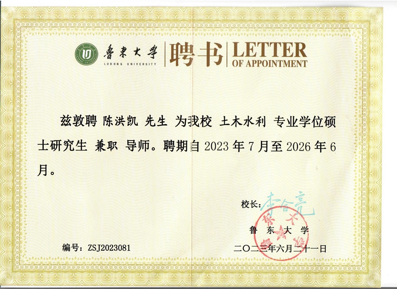 公司俄罗斯自然科公司外籍院士陈洪凯教授受聘鲁东大学土木水利专业硕士生导师