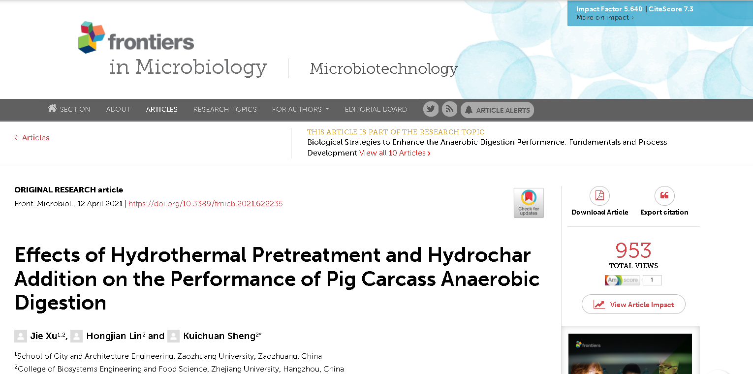 近日,betway西汉姆联平台固废资源化综合利用科研小组在水热炭调控厌氧消化研究方面取得最新进展,相关工作发表在国际著名期刊《Frontiers in Microbiology》(中科院一区,TOP期刊,影响因子5.640)上,论文题目为《Effects of hydrothermal pretreatment and hydrochar addition on the performance of pig carcass anaerobic digestion》,betway西汉姆联平台为第一单位,徐杰博士为论文第一作者。