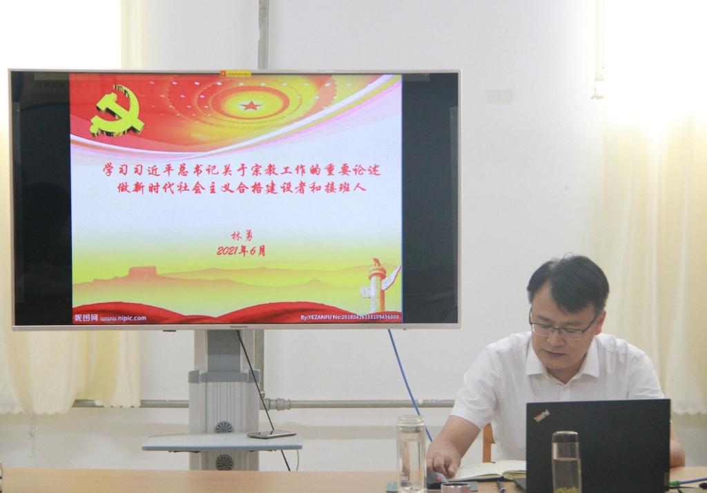 林勇以《学习习近平总书记关于宗教工作的重要论述 做新时代社会主义合格建设者和接班人》为题,从“宗教工作的意义和重要性”、“宗教的基本知识”、“党的宗教工作方针政策”及“如何抵御渗透和防范校园传教”四个方面系统阐释了习近平总书记关于宗教工作的重要论述,强调要牢牢坚持党的宗教工作基本方针,提高政治站位,扛稳政治责任,保持清醒头脑,强化基础工作,抵御宗教渗透,防范校园传教。