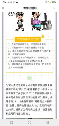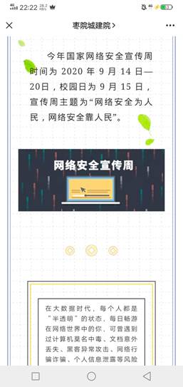 网络安全宣传周活动期间,公司积极开展线上、线下相关活动,不断强化主题宣传教育。9月16日,公司组织各班级开展了“网络安全与我同行”主题班会,通过学习相关材料,同学们了学习到了更多有关网络安全方面的内容。通过班会的学习、讨论之后,各班组织了同学们参加全民网络安全知识竞赛,激发同学们学习网络安全知识的兴趣,提升网络安全防护技能,增强安全防范意识,提高识别和应对网络危险的能力。通过公司官方微信、网站等新媒体推送网络安全知识,引导公司师生正确使用网络,提高网络道德观和法制观。多种形式广泛宣传个人网络信息保护、电信诈骗、网络暴力、网络法律维权等安全知识。