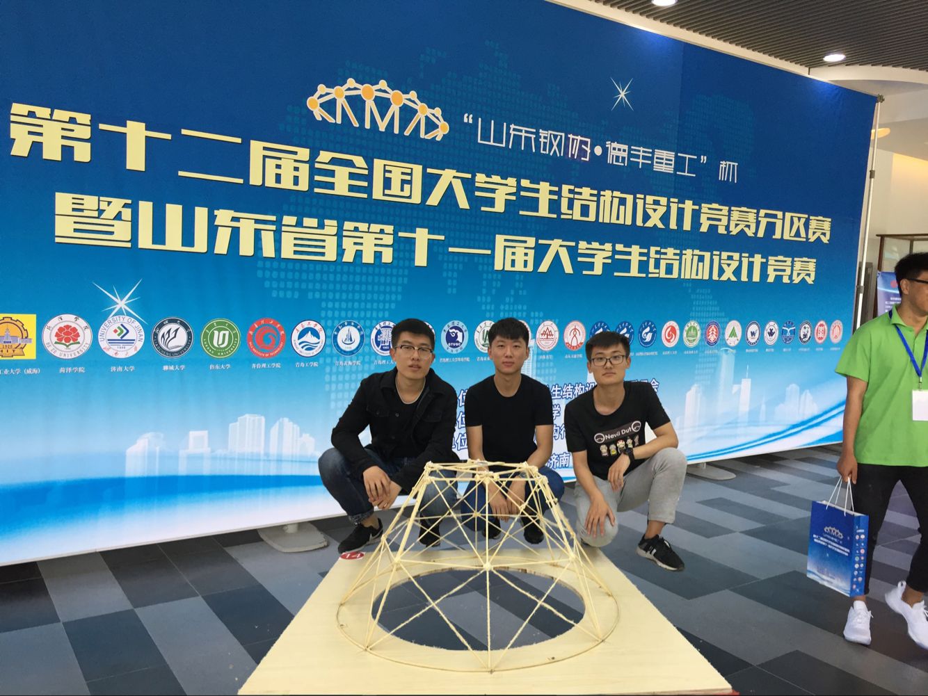 本次大赛,有来自山东大学、哈尔滨工业大学(威海分校)、中国石油大学、青岛理工大学等28所省内高校的31只队伍参加。公司由赵澄、张耀、贾传奇三名同学组成的队伍在袁下下、李晓明老师指导下参加了比赛。竞赛以“承受多荷载工况的大跨度空间结构建模设计与制作”为赛题,模型采用竹质材料制作,并在加载现场施加一级、二级竖向荷载和三级水平荷载来考验结构模型的挠度和承载能力。评委对各参赛队在设计计算、结构选型与制作质量、现场表现、模型承载力、模型刚度五个环节中的表现分别评分,最后由组委会来综合评定各队总得分。公司作品“简约”成功通过了一级竖向荷载40KG、二级最大竖向荷载24KG和三级最大水平荷载8KG后完好无损。据统计,其中31个比赛作品中有1/3的作品在没达到要求承载荷载前模型已破坏。