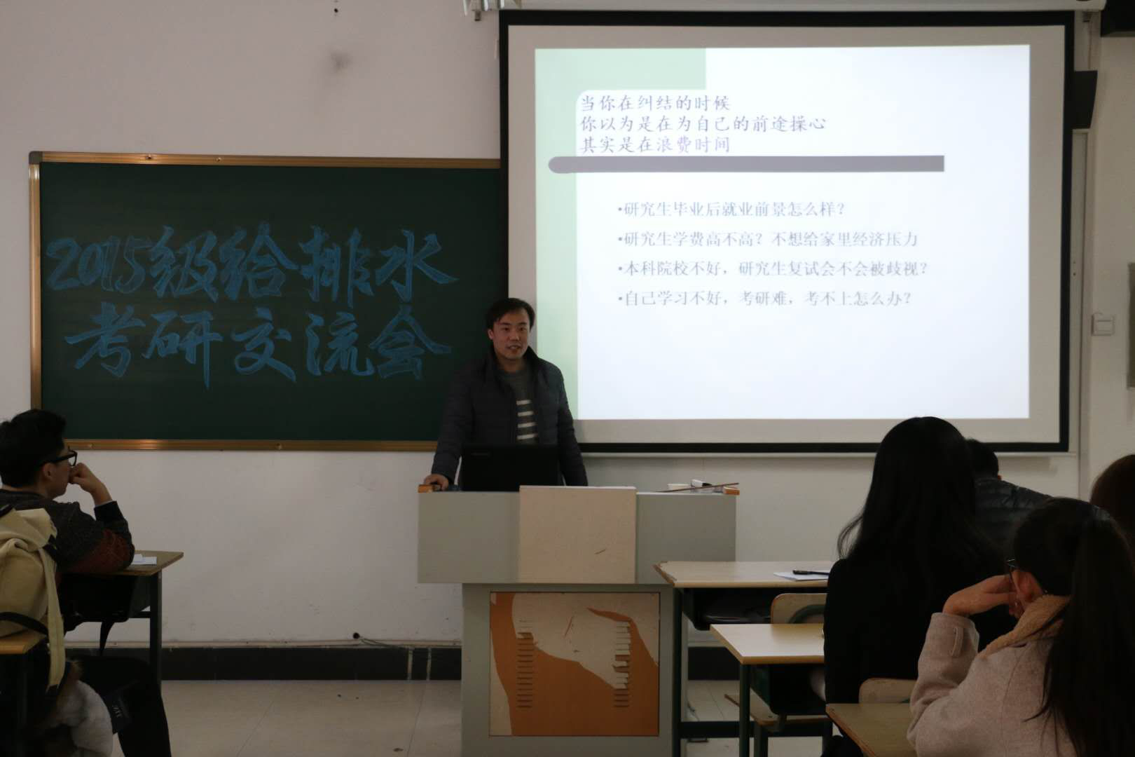 根据公司工作安排,betway西汉姆联平台于12月19日下午2:00,在理工楼301教室举办了2015级给排水专业考研交流会,给排水教研室全体专任教师、2015级给排水专业员工以及部分低年级同学参加了本次交流会。