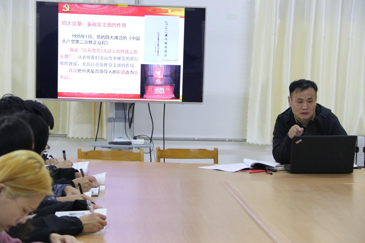 本次党课的主题是党章总纲解读。李书记首先带领大家回复了历次党章修改的过程,使大家认识到:党章是立党治党管党的总章程,是政党内部最基本和最高的政治行为规范,是一个政党的政治态度和组织形态的集中体现,是完备的党组织不可缺少的。随后,李书记介绍了历届党章概述,着重强调了十九大党章中的亮点和创新之处是把习近平新时代中国特色社会主义思想确立为指导思想。李书记要求全体积极分子要加强党性修养,做学习的模范;要注意树立正确的审美观,要始终牢记个人欲望并不是人生理想,要始终重视自身德育建设,立鸿鹄之志,练好自身本领,未来建设好国家。