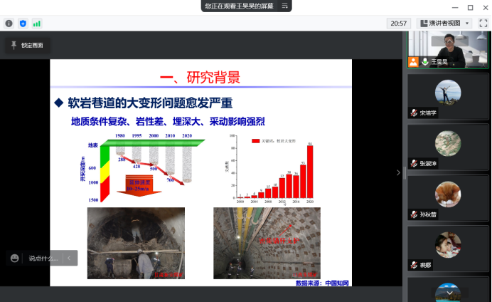 城市地下空间教研室的王昊昊博士做了题为《切顶卸压无煤柱自成巷关键技术及其在深部矿井的应用研究》的学术报告,报告从“无煤柱自成巷技术介绍”“切顶成巷应力演化规律和支护对策”“工程应用效果”三个方面展开讲解,向全院教师介绍了深部岩土力学和软岩大变形领域的研究进展及面临的主要挑战,两项关键技术:“恒阻大变形锚索”、“定向预裂爆破”对于推进地下空间工程开发和复杂地质条件地下空间维护具有借鉴作用。报告结束后,公司教师就报告中的内容与热点问题,结合各自研究领域互相交流研究心得,并结合自身经历向青年教师分享了开展科研工作的经验与感悟。