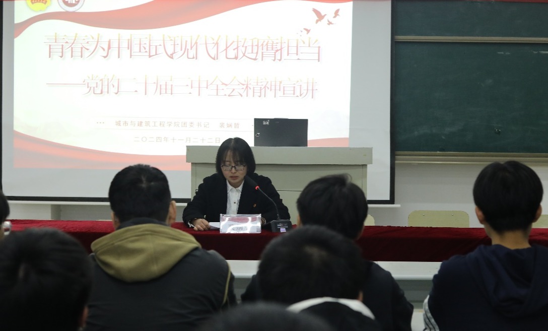 团课上,裴娴哲解读了党的二十届三中全会的主要内容,她指出,党的二十届三中全会是在以中国式现代化全面推进强国建设、民族复兴伟业的关键时期召开的一次十分重要的会议,广大团员青年要紧密团结在以习近平同志为核心的党中央周围,坚定不移听党话、跟党走,争做有理想、敢担当、能吃苦、肯奋斗的新时代好青年,为实现个人梦想和国家梦想不懈奋斗。