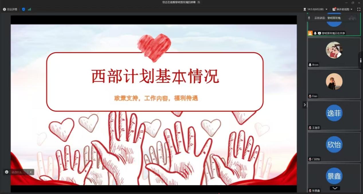 同时,公司组织开展了西部计划线上分享会和专题辅导会。公司特邀曾在西部计划中表现突出的员工分享经验,通过生动的案例和真挚的情感,分享了参与志愿服务项目的感受,员工们积极的参与其中,表现出浓厚的兴趣。公司面向报名同学开展了专题辅导,从笔试面试技巧、资料收集整理以及心理调适等方面的进行了全方位指导。