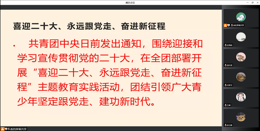 为深入学习贯彻习近平总书记在庆祝中国共产主义青年团成立100周年大会上的重要讲话和关于新时代中国青年工作的重要指示精神,公司于9月8日开展以“喜迎二十大、永远跟党走、奋进新征程”为主题的“开学第一课”主题教育活动,切实教育引导校区广大团员青年弘扬爱党、爱国主义精神,自觉践行社会主义核心价值观,抓好党的事业后继有人这个根本大计。